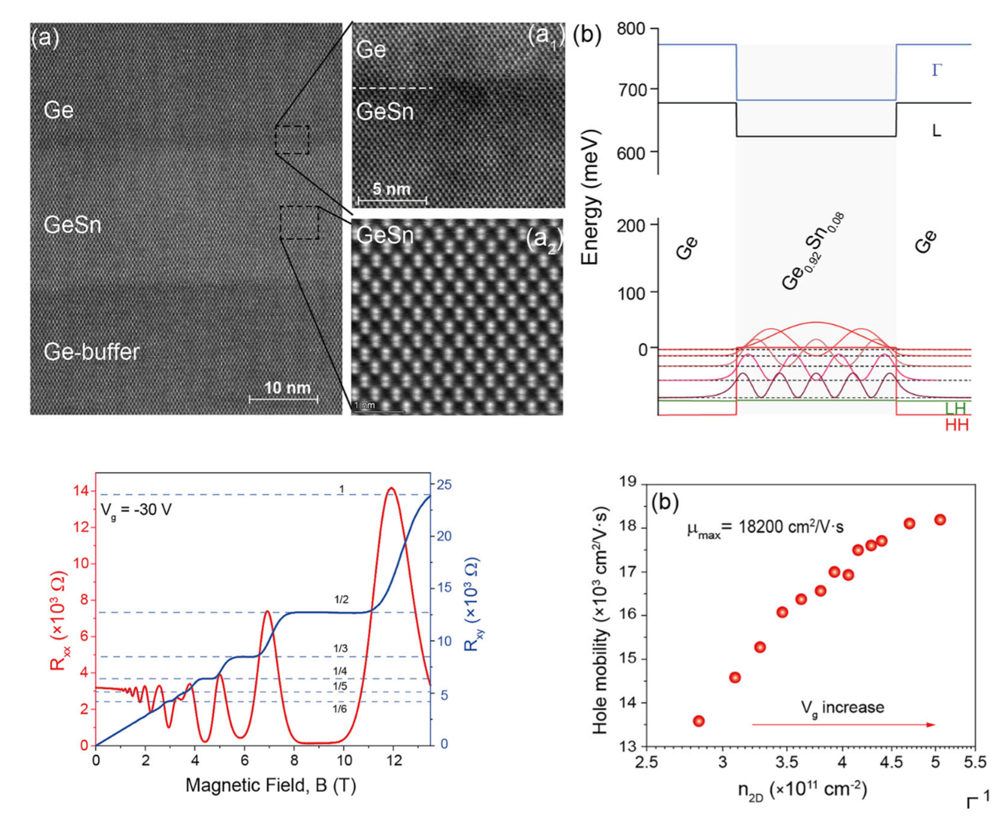 The GeSn quantum well. Top row: structural analysis through TEM imaging (left), and band structure diagram (right). Bottom row: electronic characterization with quantum hall effect (left) and hole mobility (right). Figures adapted from Fig. 1 and Fig. 2 in Ref. 1.